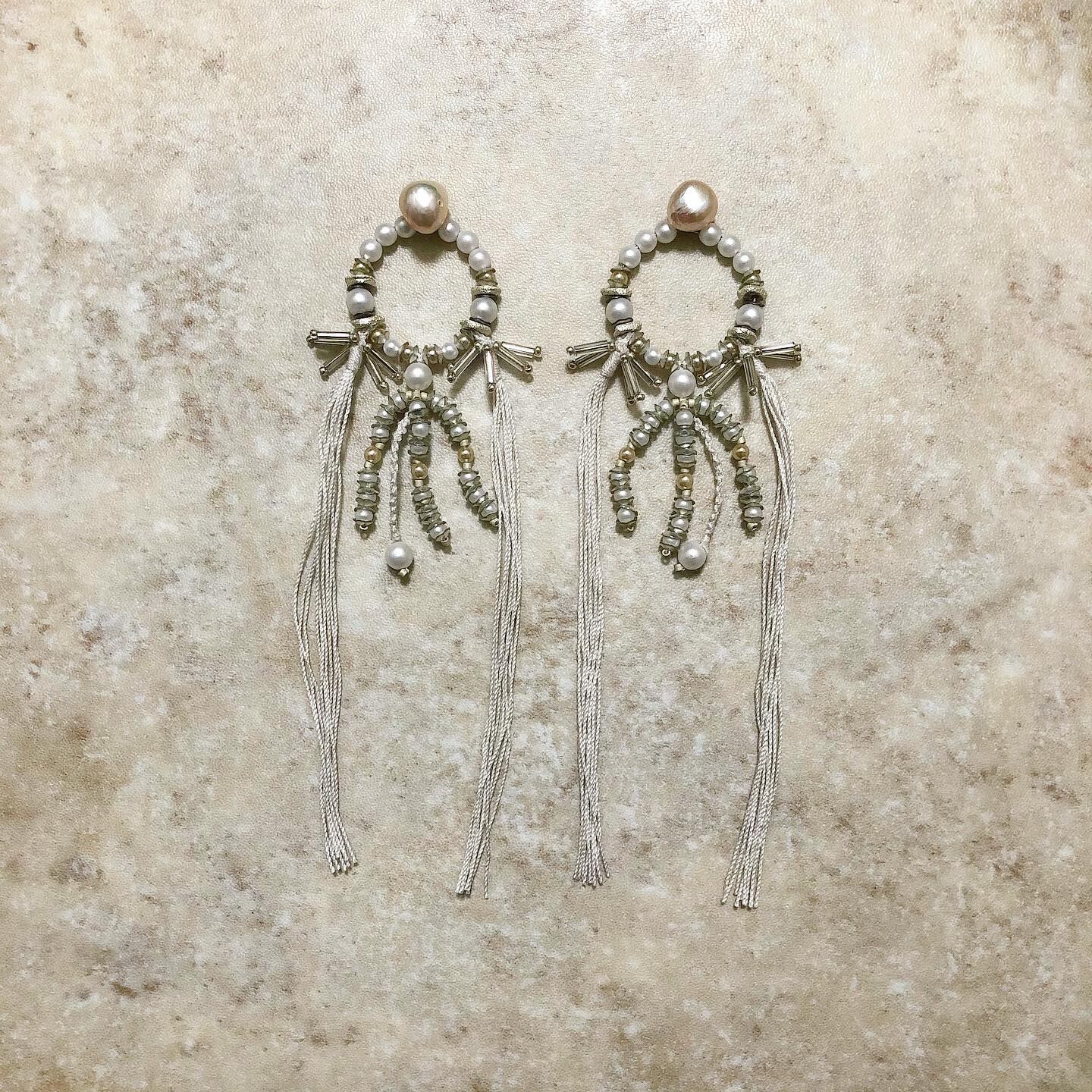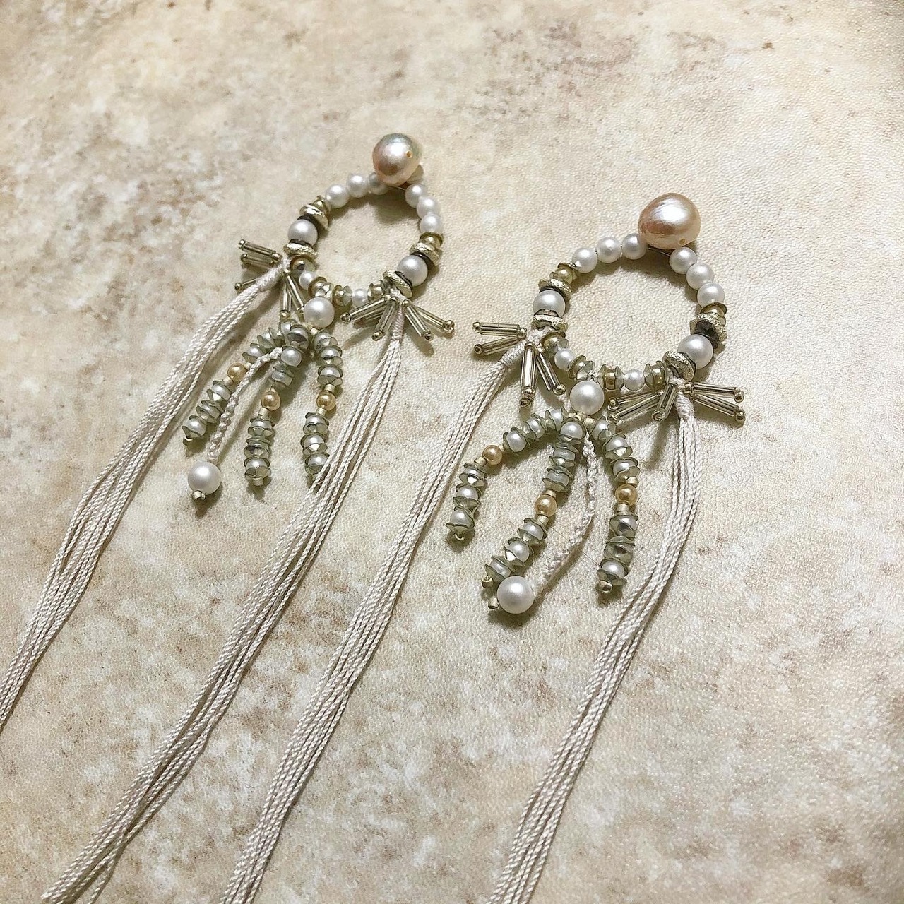 くすみ系をメインに4種類のパールと白銀系のスパンコール、合金ビーズのフープ。
