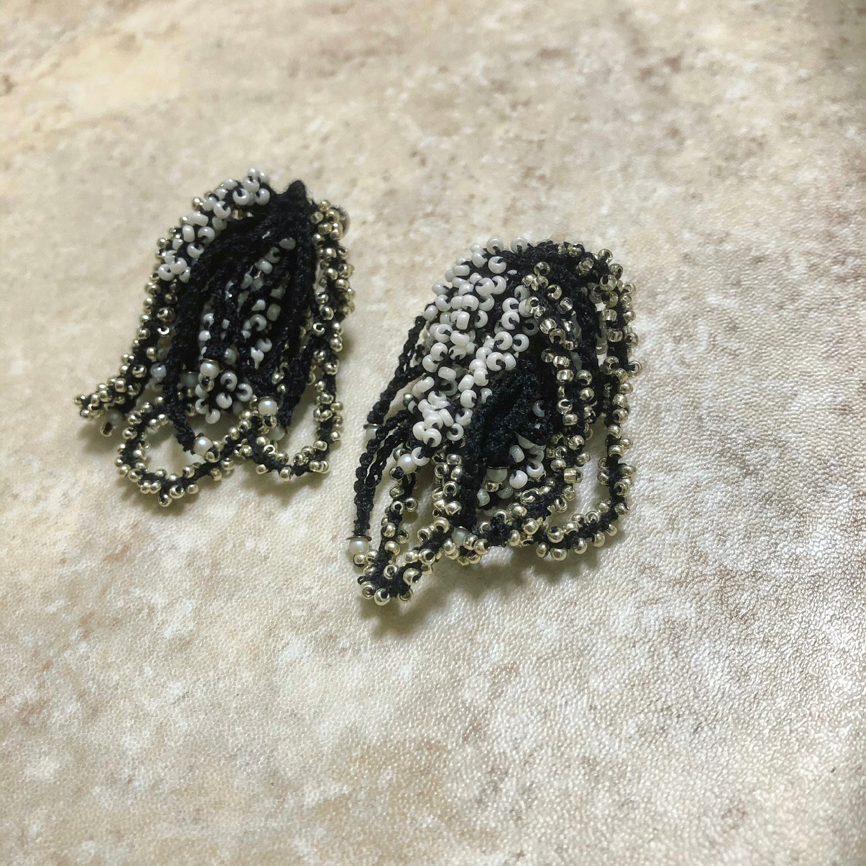 ショートフリンジ:黒糸の鎖編みに2種類のビーズ、パールを散らしました。