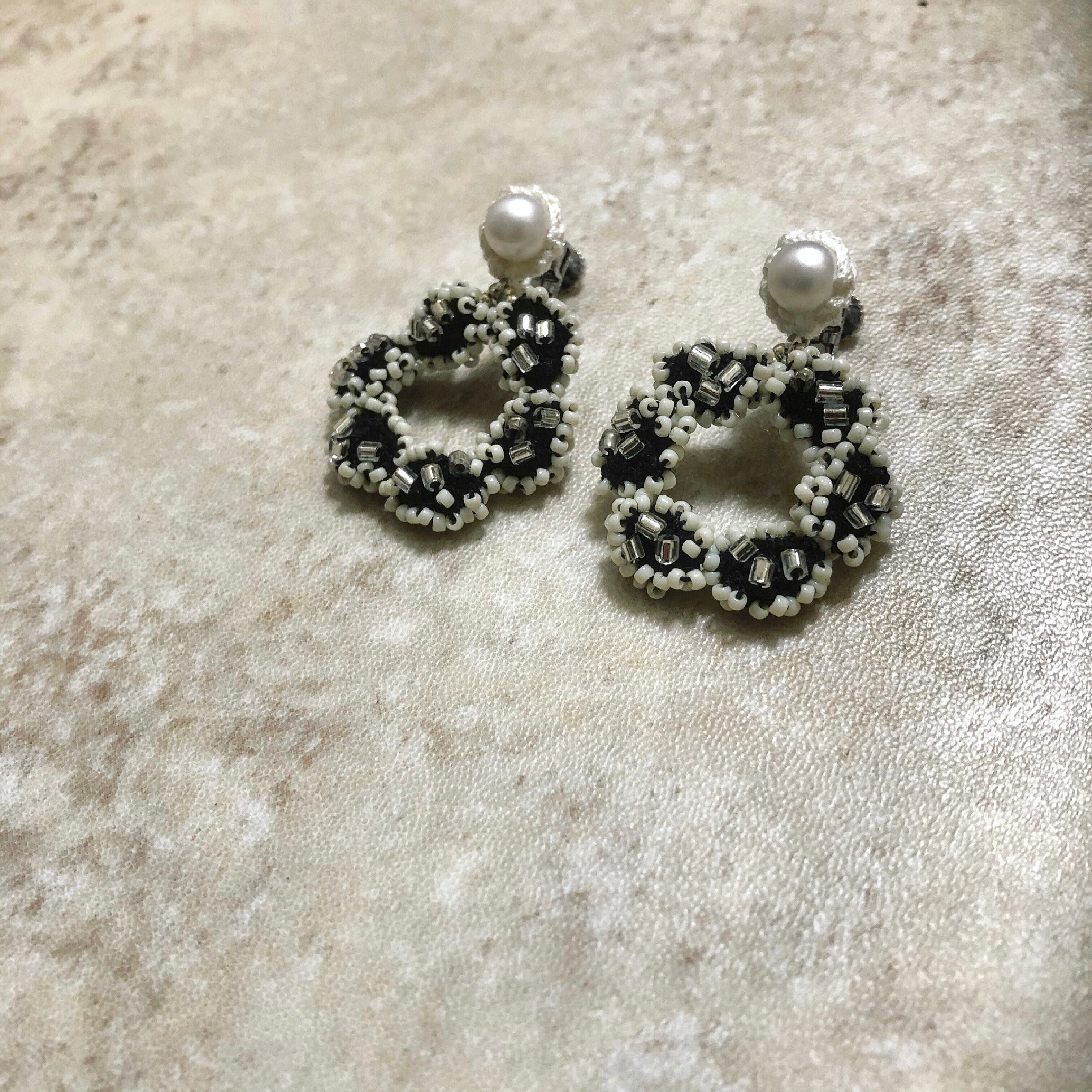 ころんと立体的な楕円を編んで繋げ、輪っかを製作し、生成りの特小ビーズでランダムに縁取り、表裏両面にビーズを施しました。