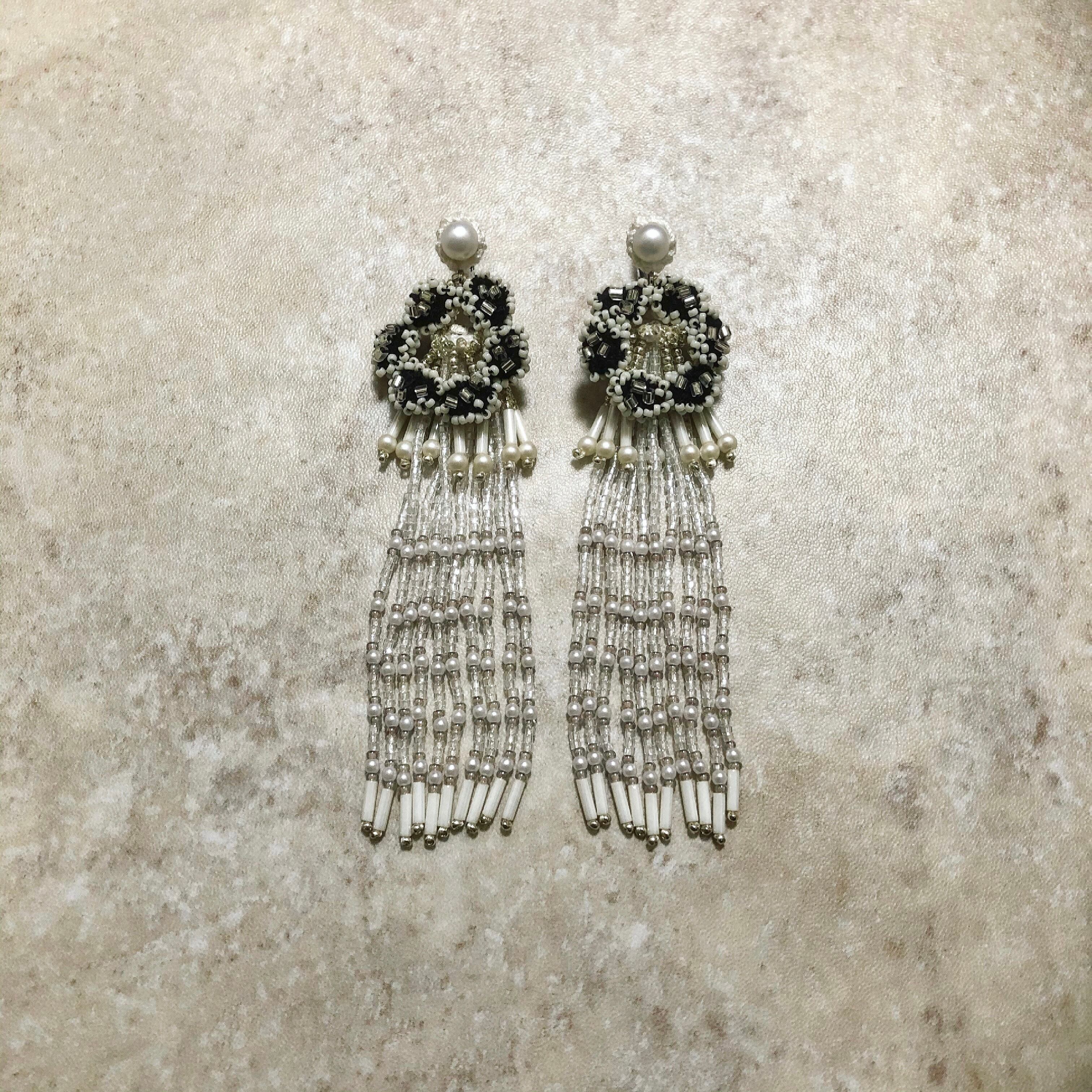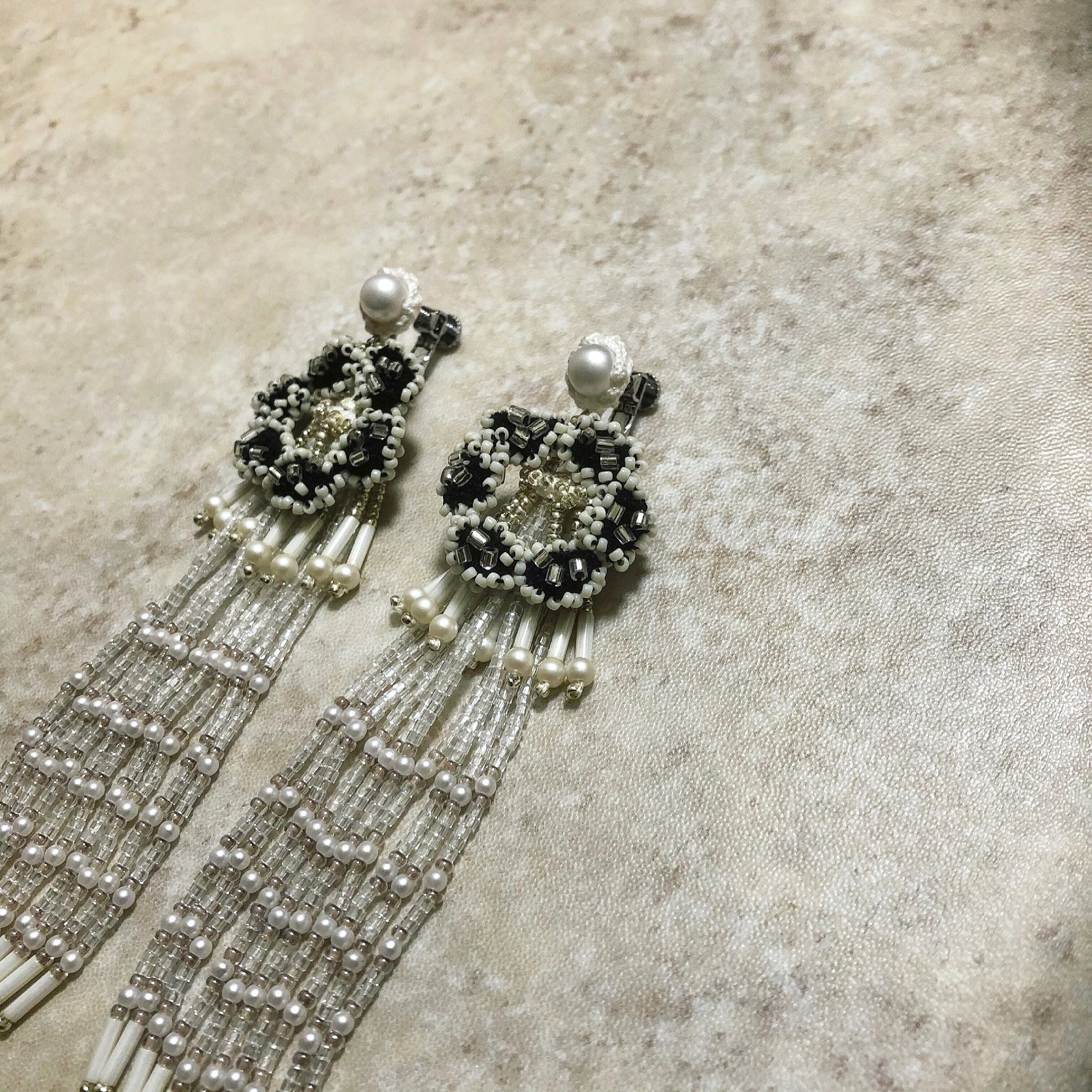 ロングフリンジは透明ガラスビーズをメインに、2種類のパールや乳白の竹ビーズを使用。