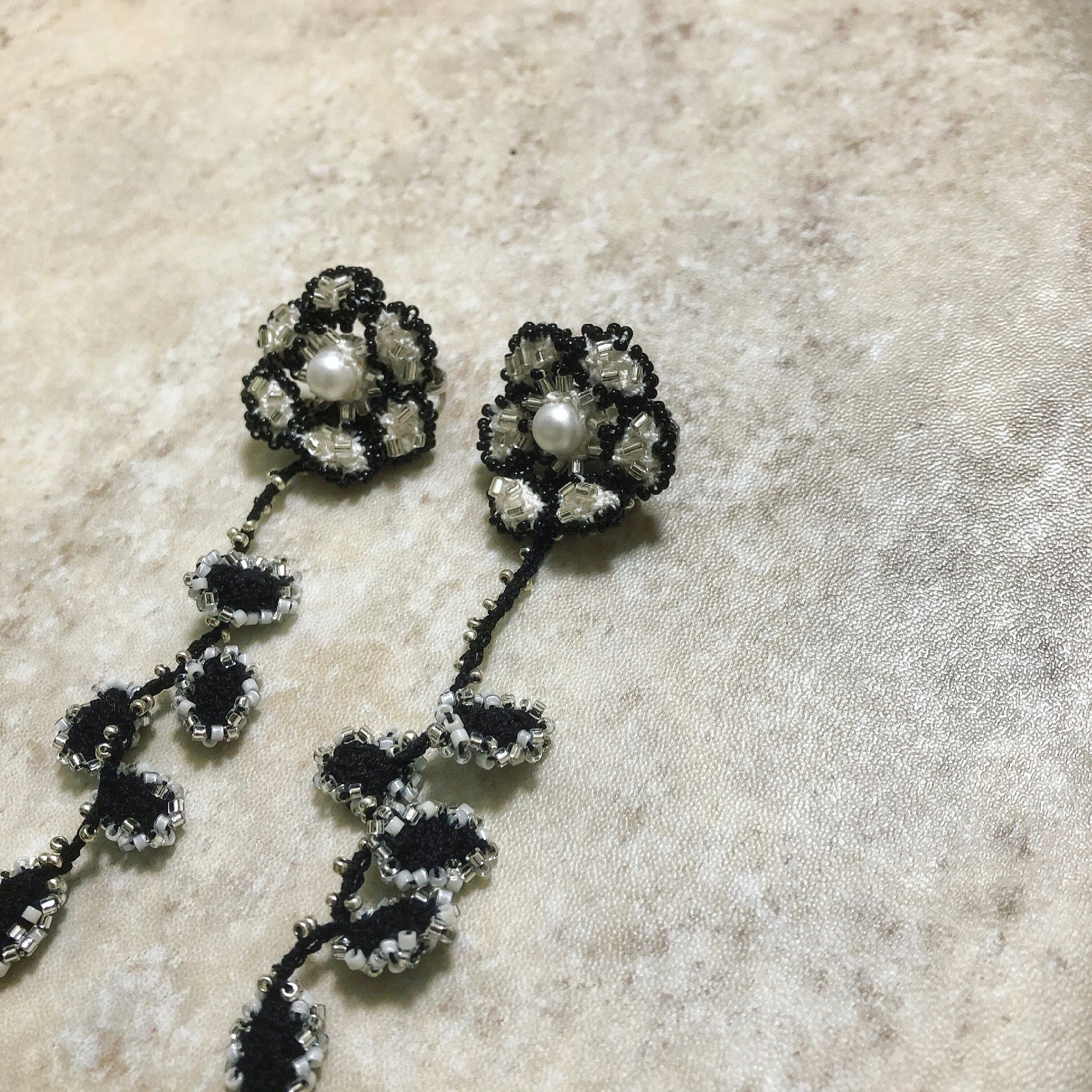 ころんと立体的な楕円を編み繋げてお花を製作し、黒の特小ビーズでランダムに縁取り、両面にビーズを施しました。