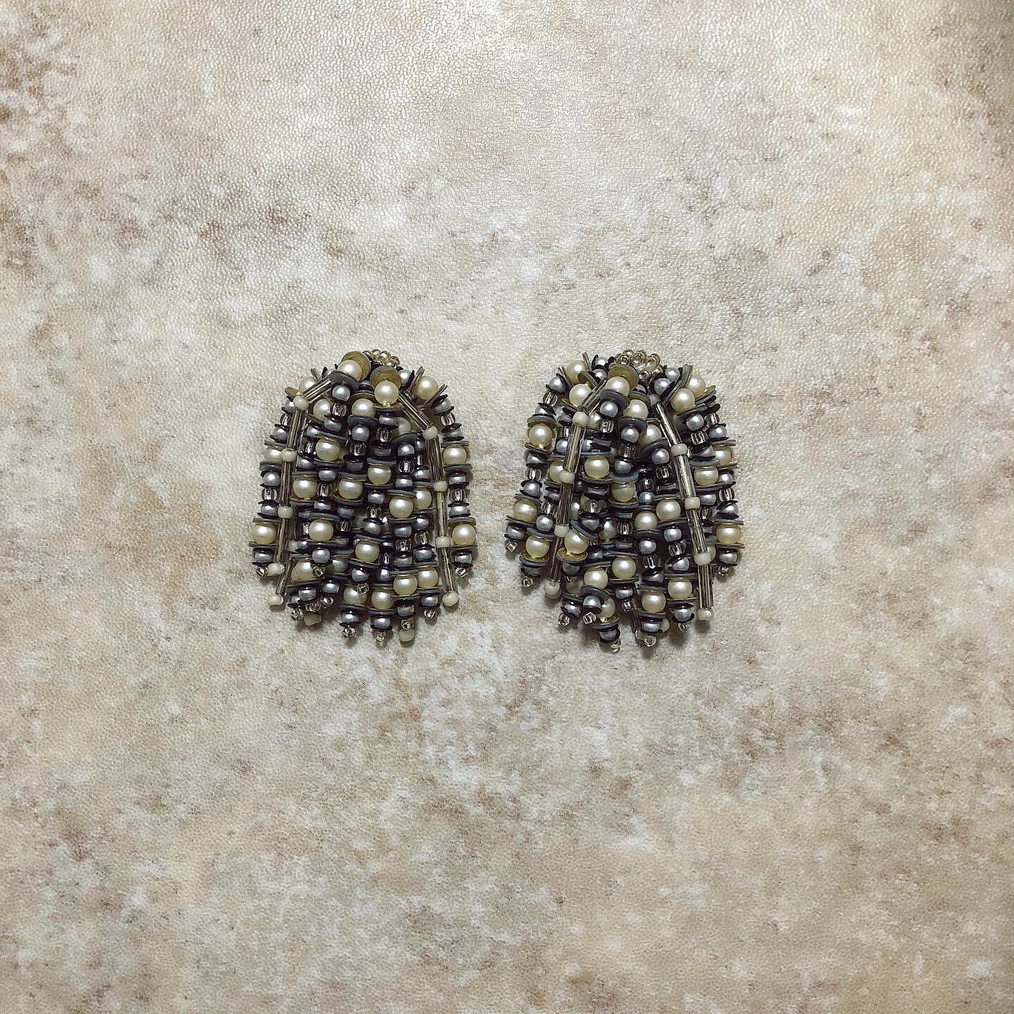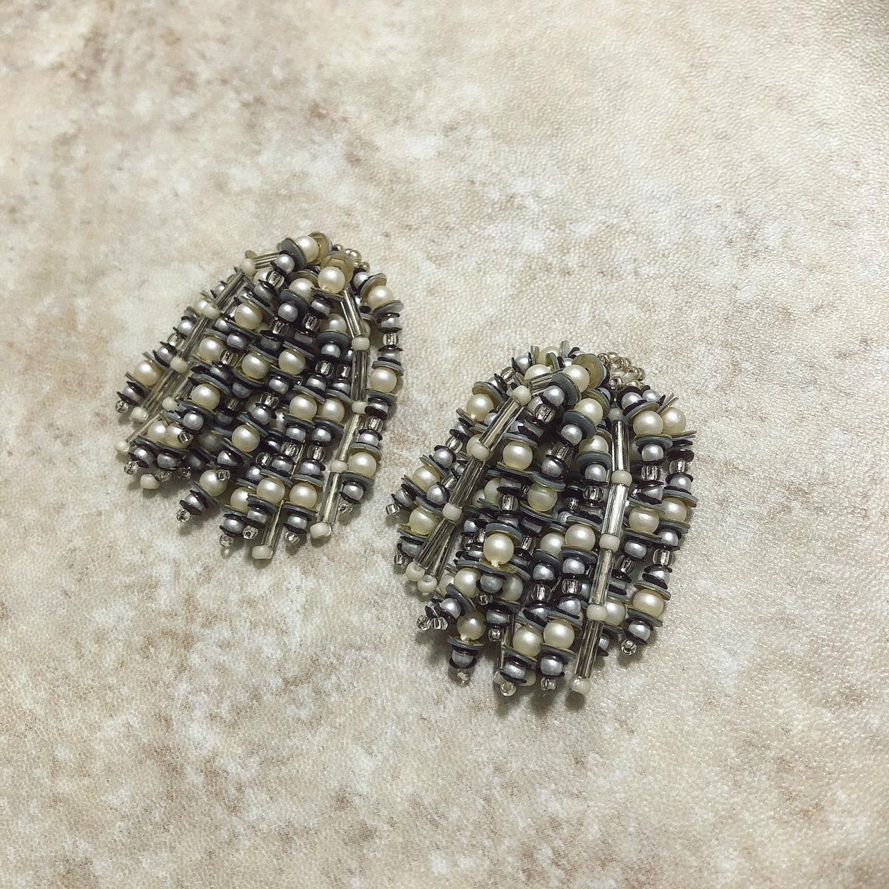 オフホワイトと生成り2種類のくすみ系パールとスパンコール、竹ビーズを混ぜました。