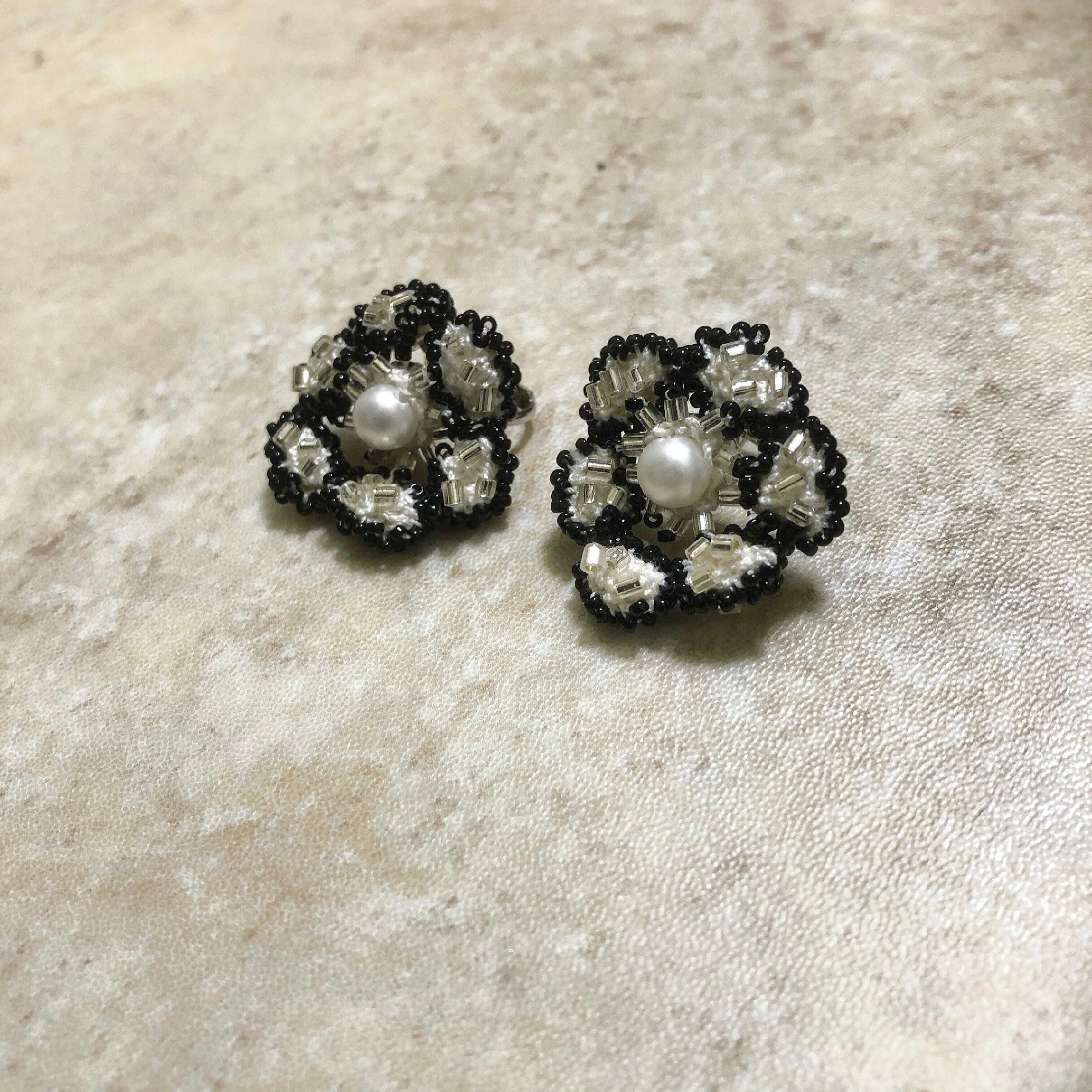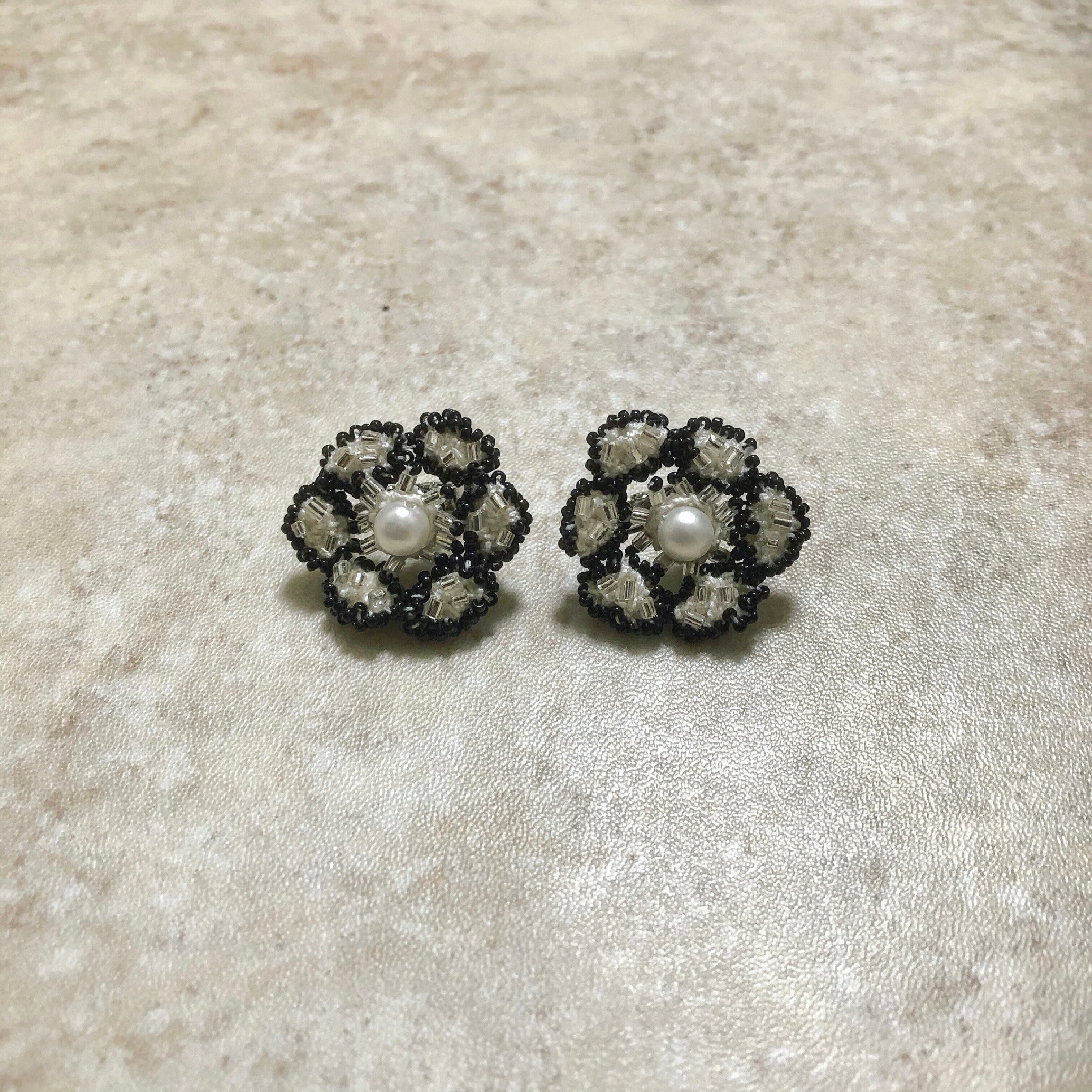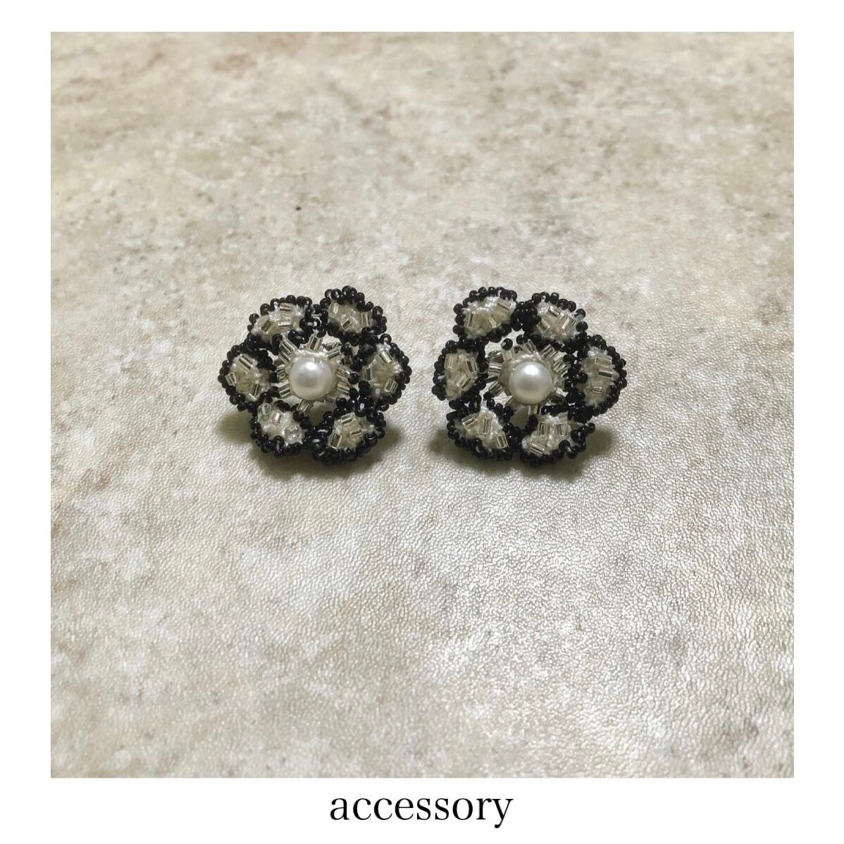 手編みで包んだパールを中心に、ころんとした楕円を編んで繋げたお花を製作し、黒の特小ビーズでランダムに縁取りました。