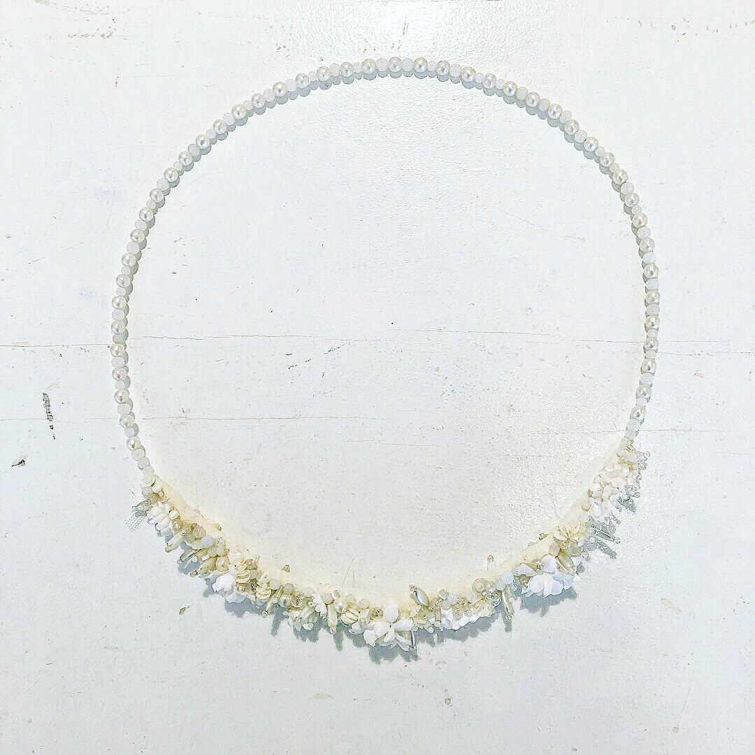 粒ビーズ・竹ビーズ・スフレ(ガラス)ビーズ・スパンコール・パール・シェル・珊瑚・布花を使用。