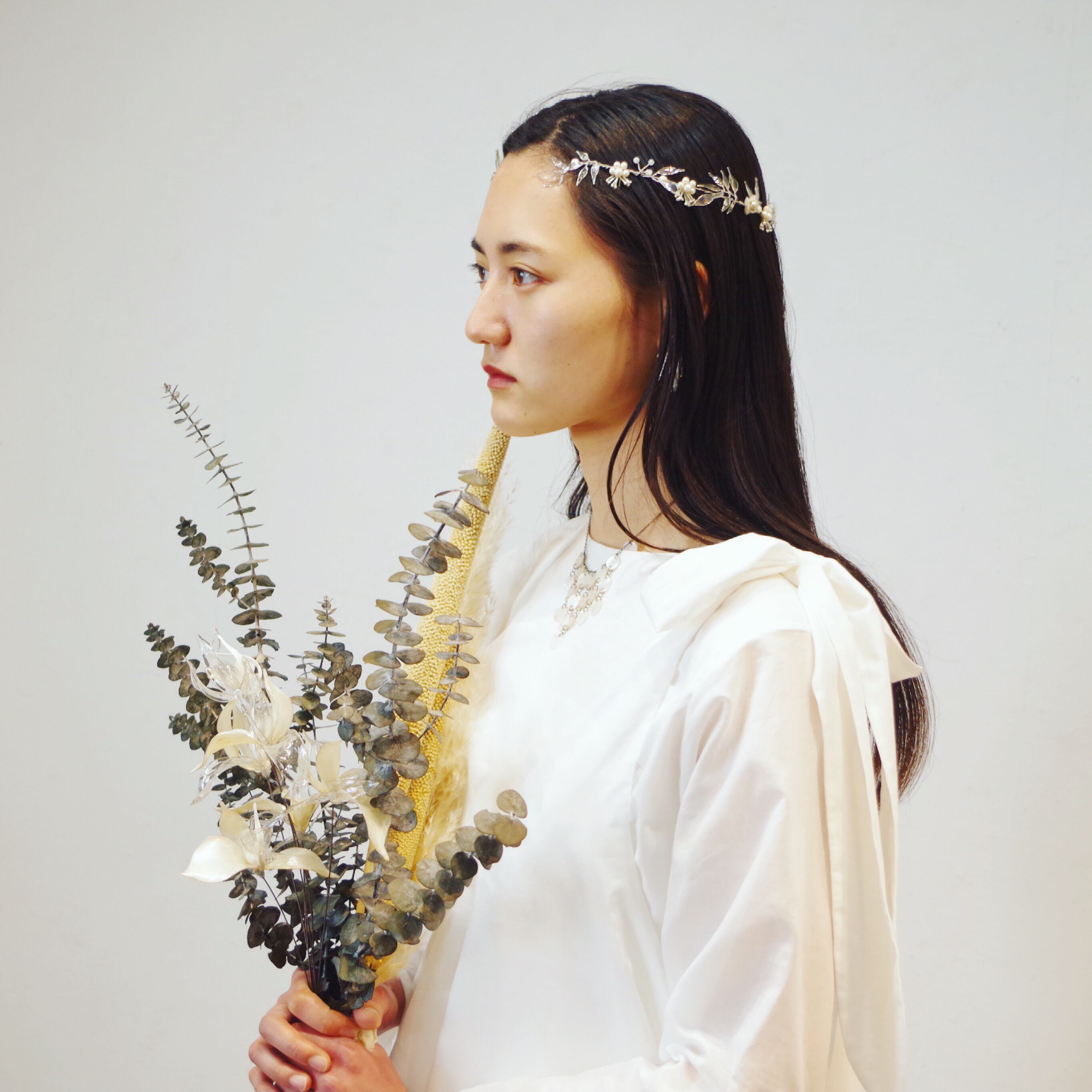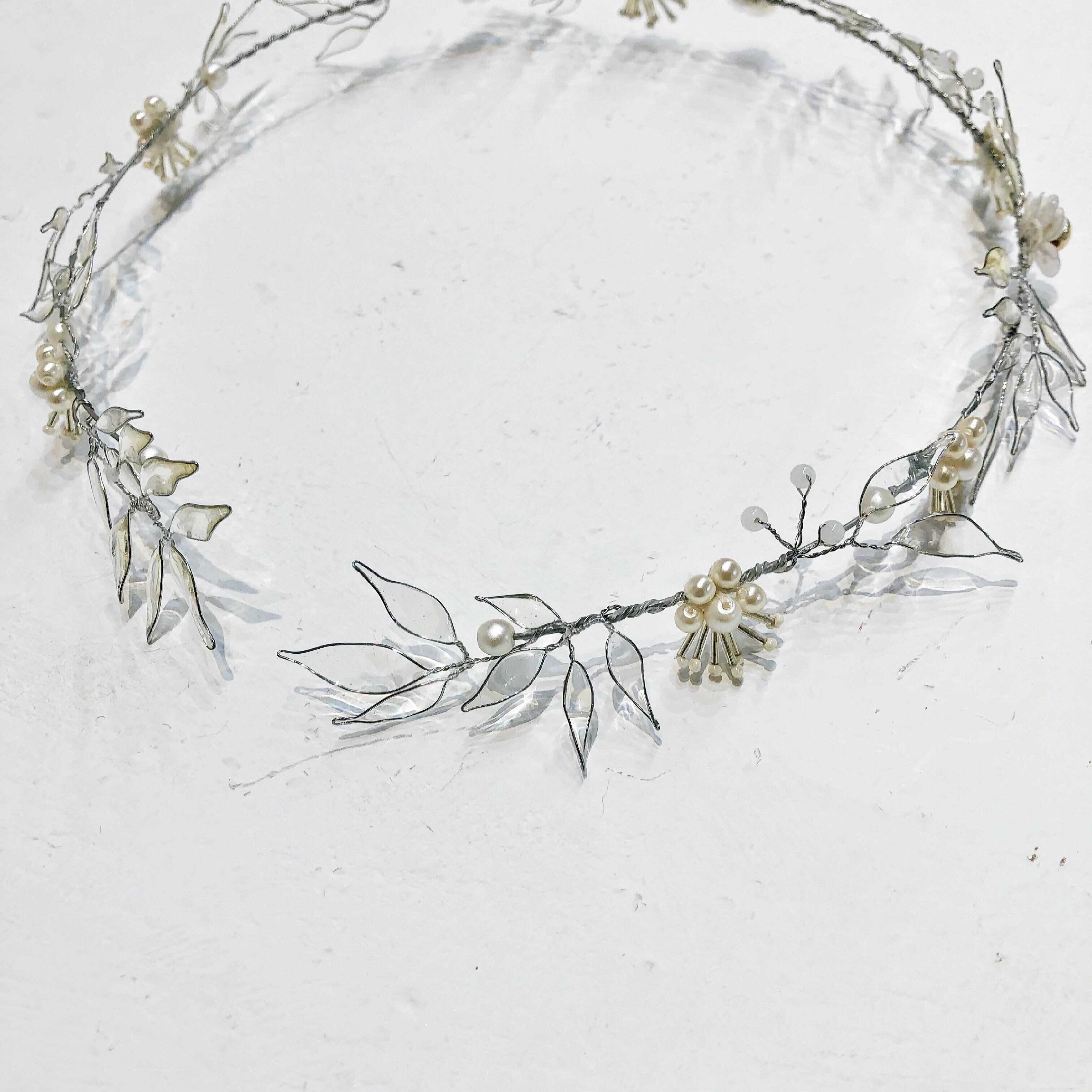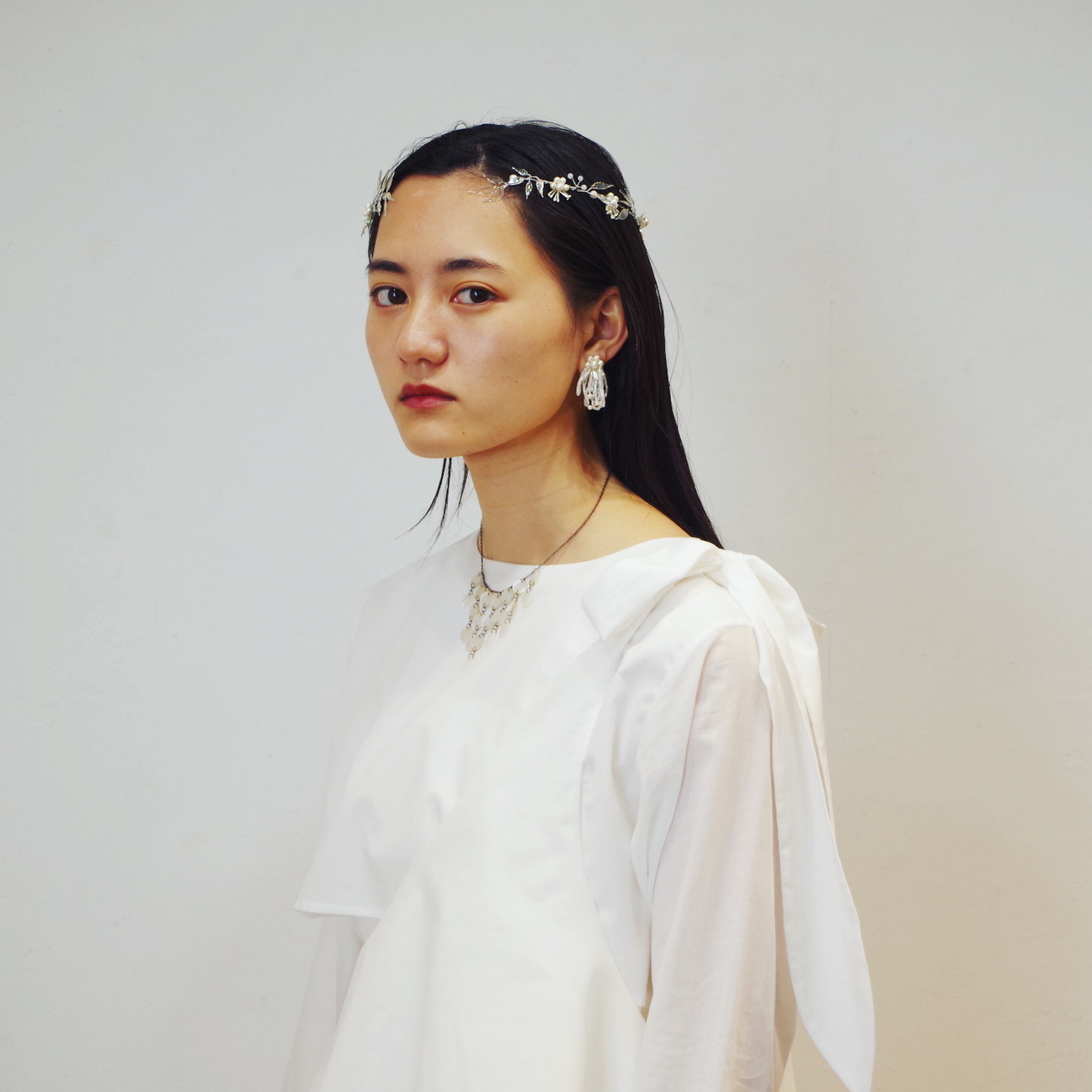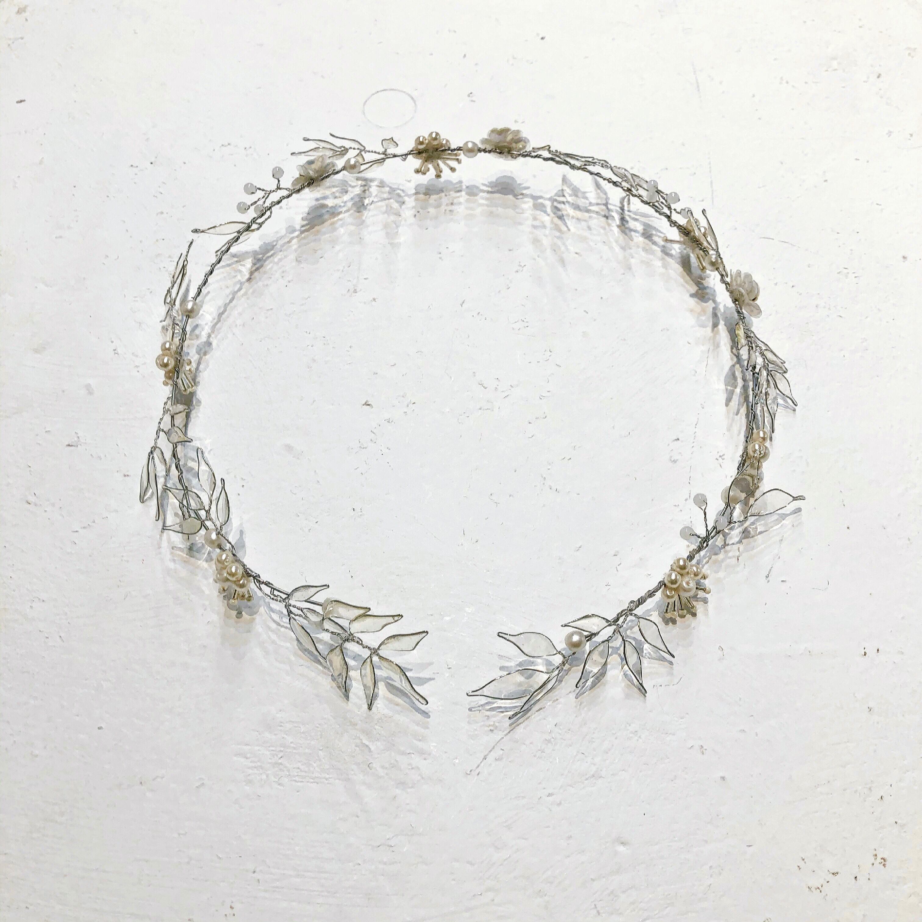 シルバー基調の開きのある葉冠型ヘッドドレス。