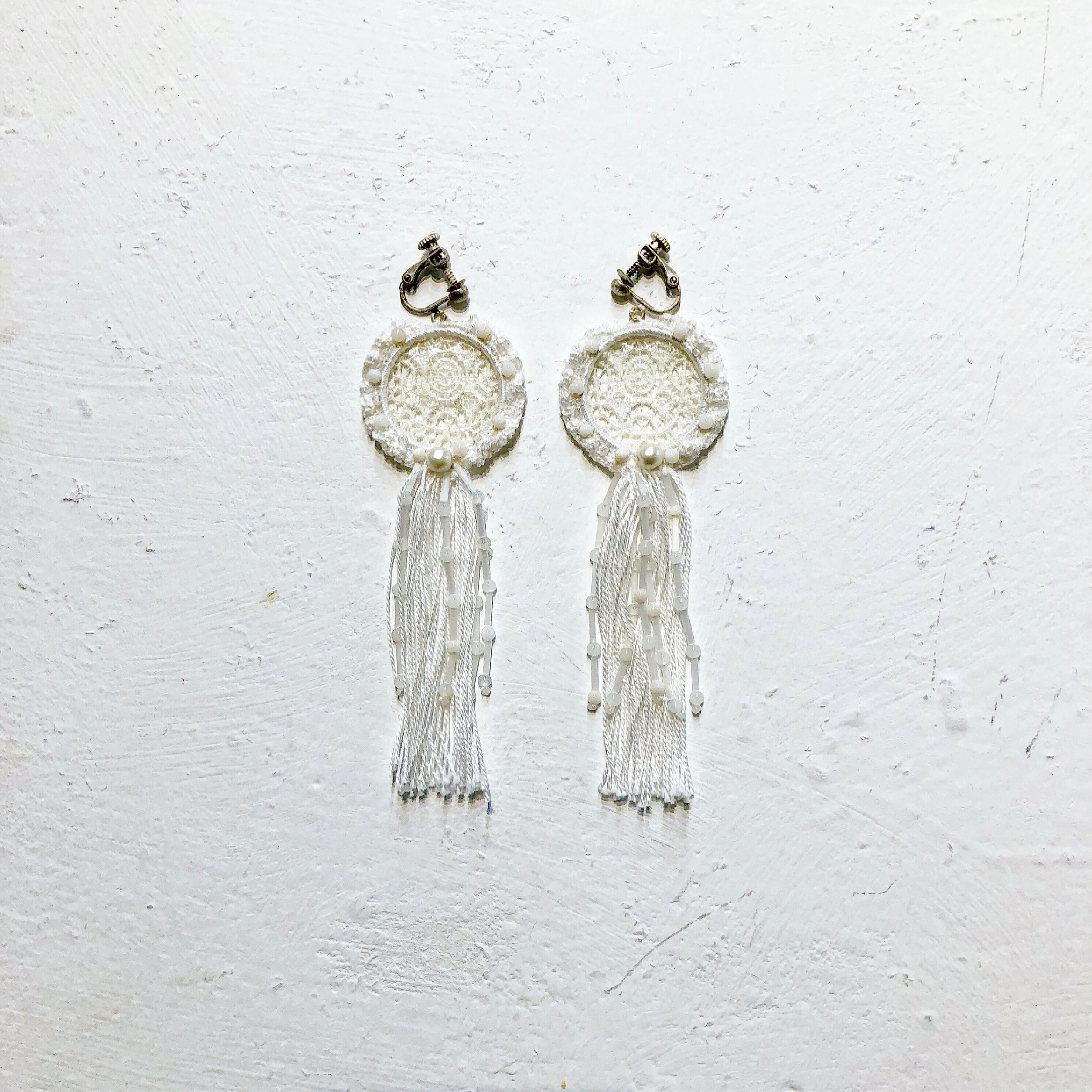 糸とホワイトの竹ビーズのフリンジを混ぜています。