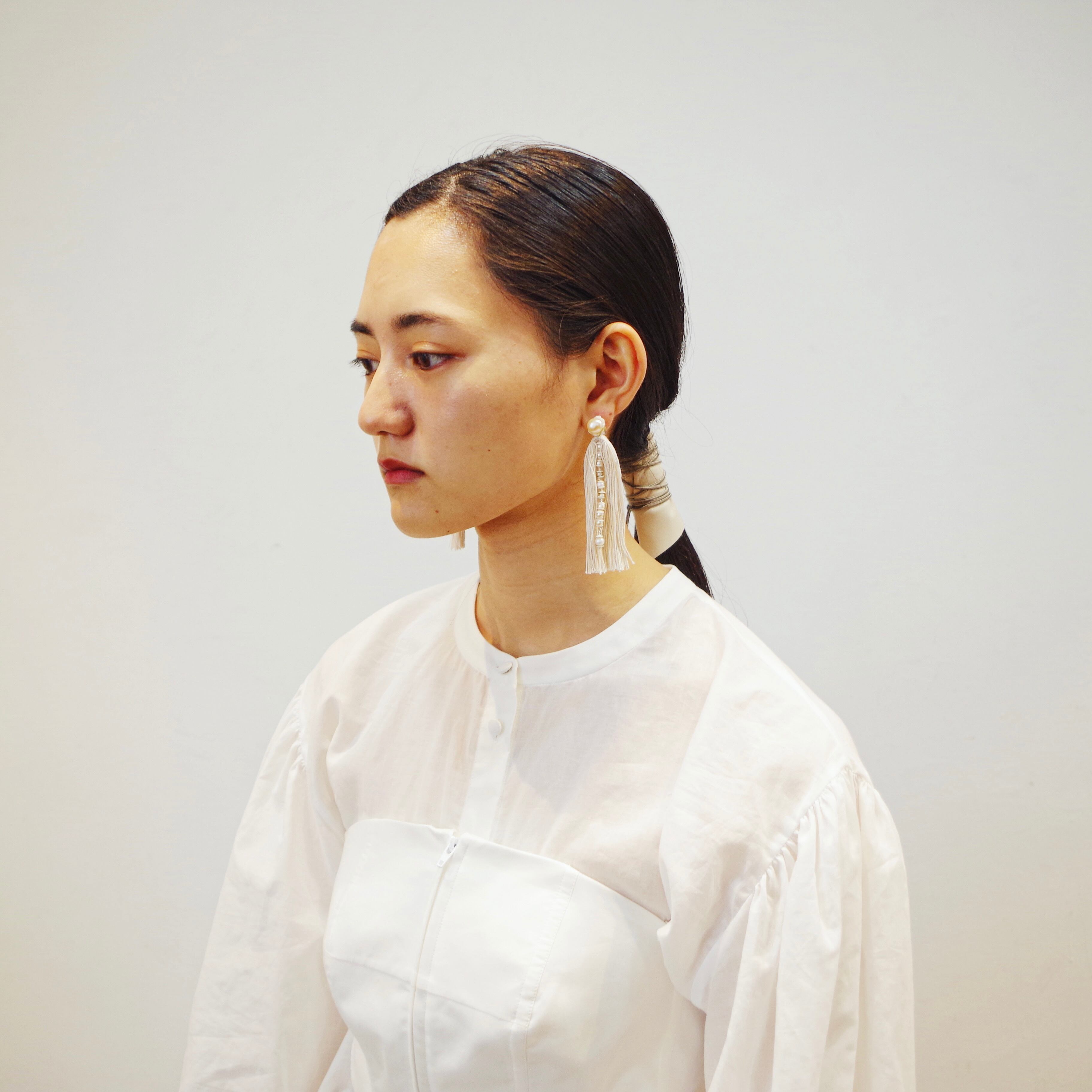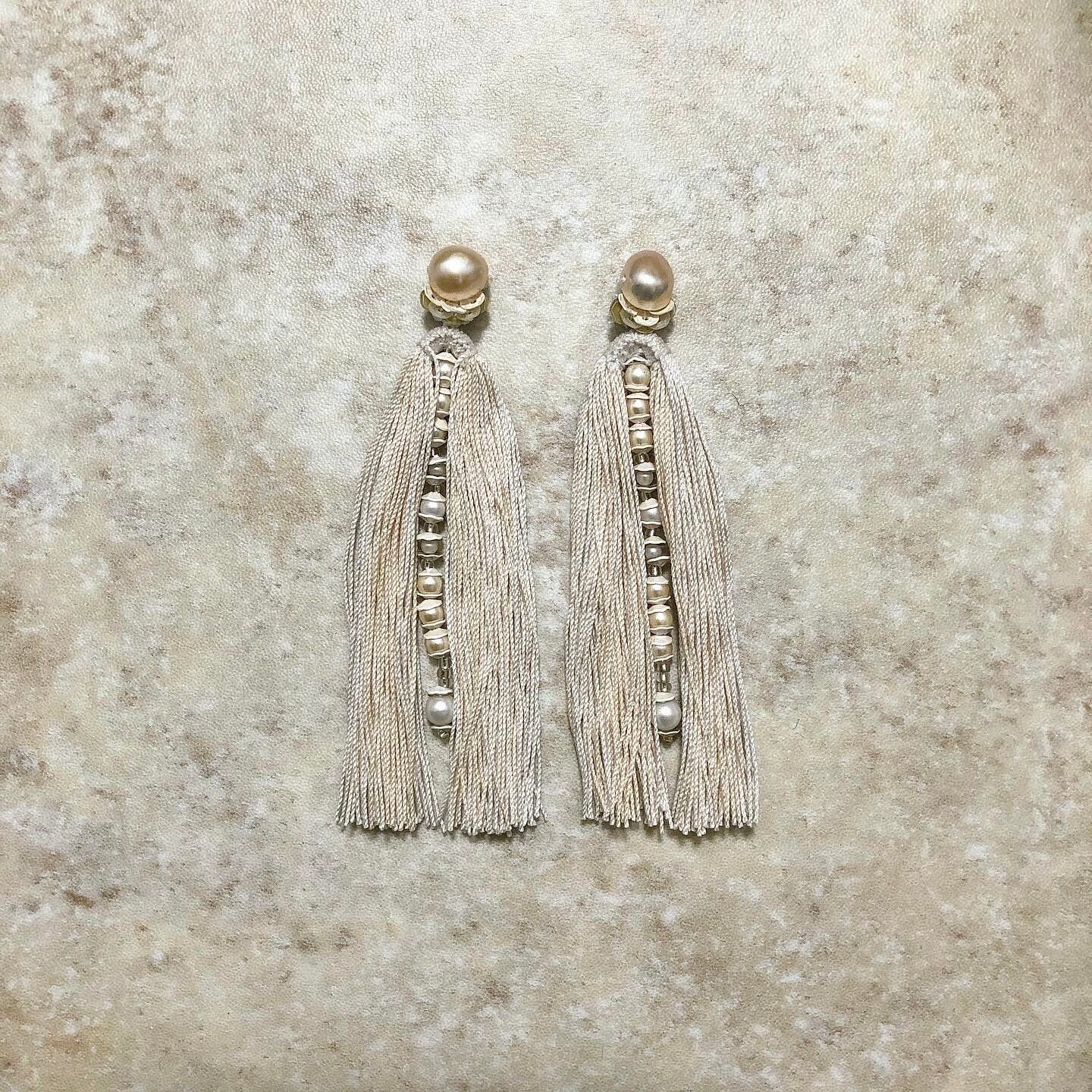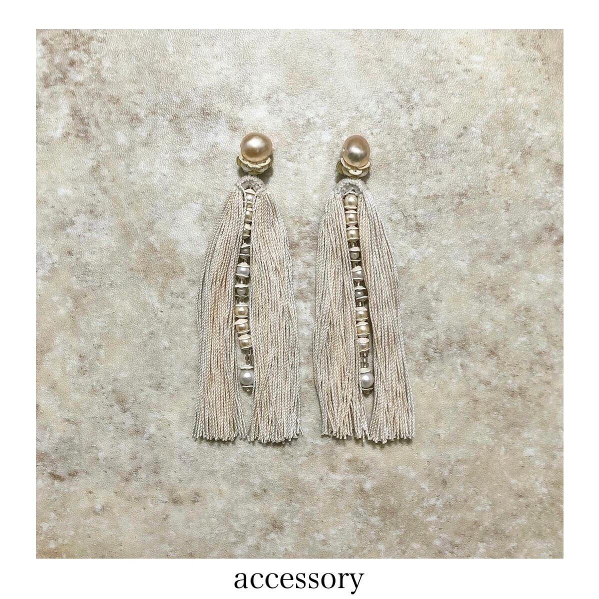 淡水パールと二又フリンジの耳飾り。