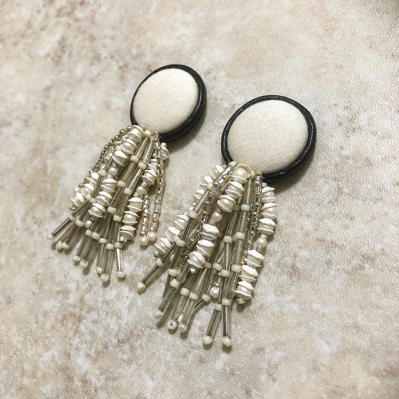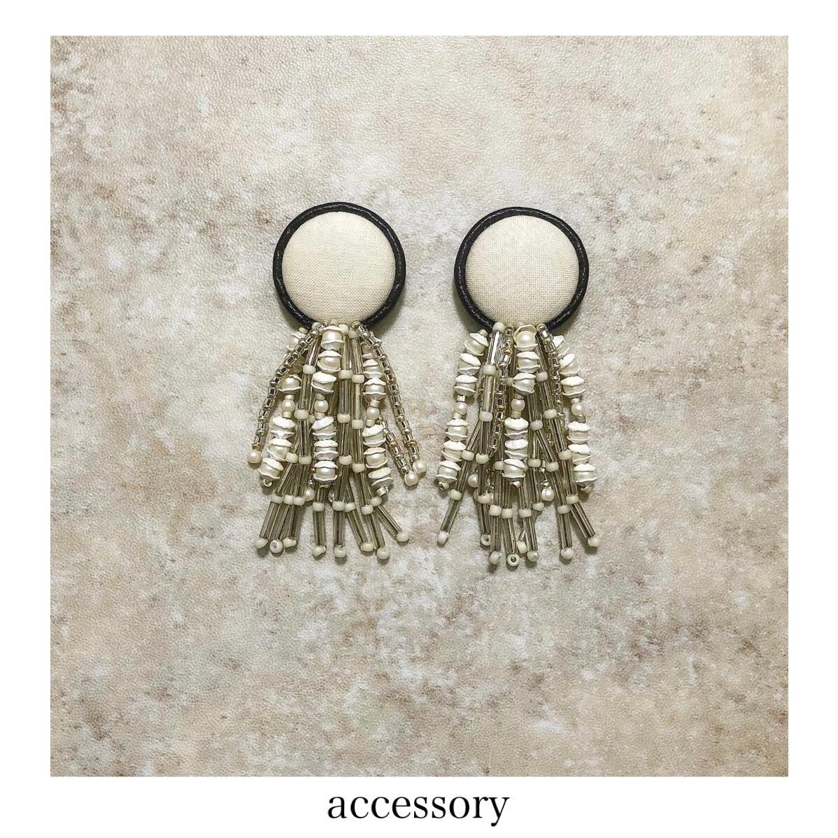 黒縁飾りのビーズフリンジ耳飾り。
