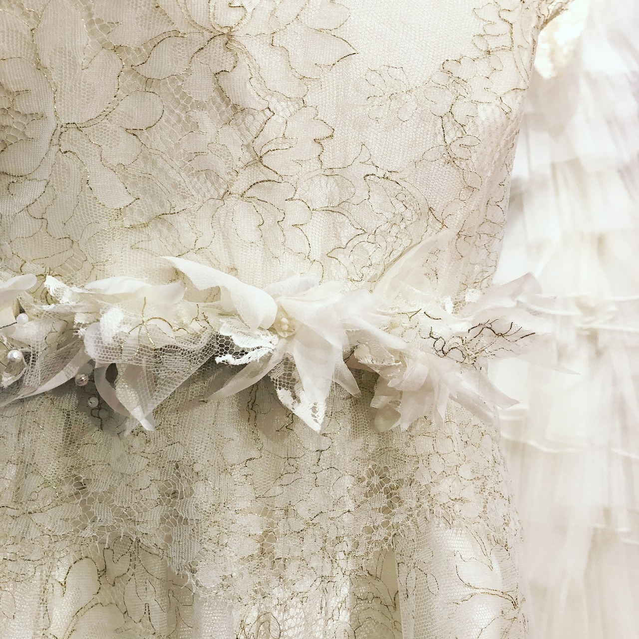 透け感のある布地やサテン、レース、チュールなどを組み合わせボリューム感を出しつつも、細いラインのベルトになるよう製作しました。