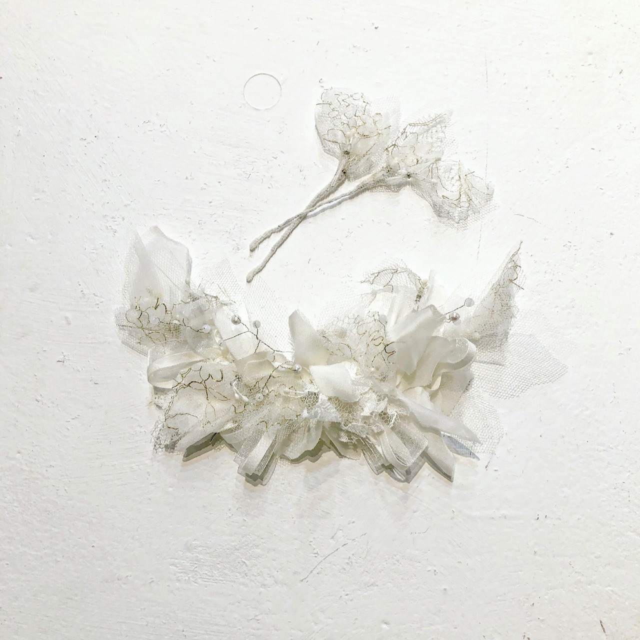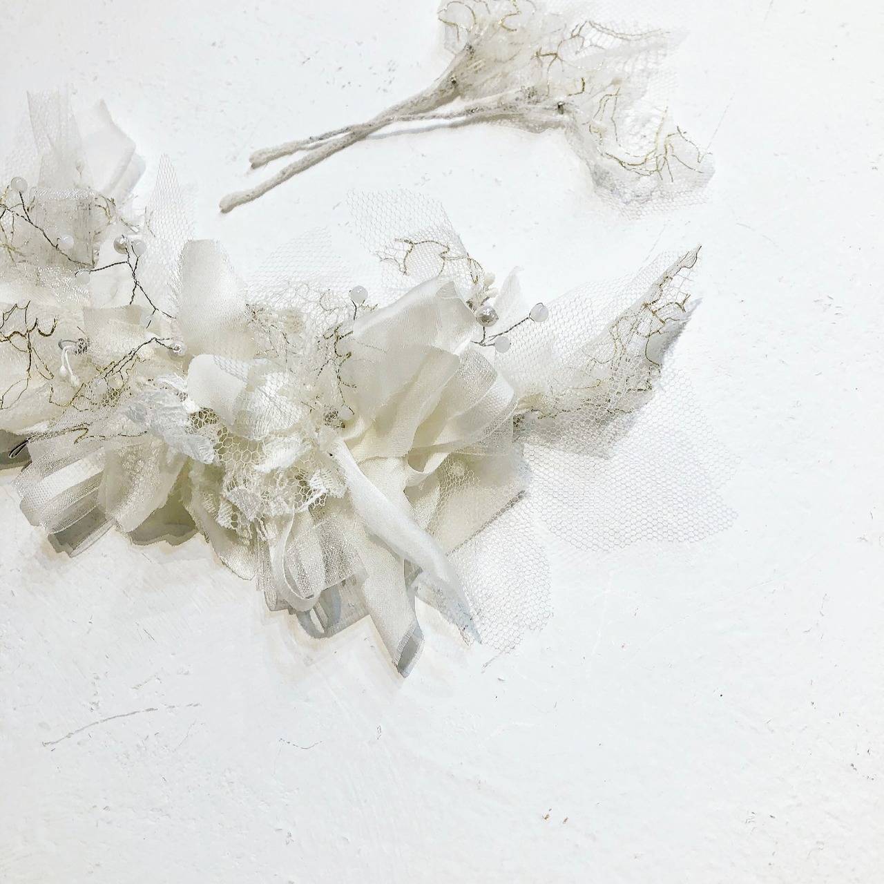 レースやチュールを混ぜた布花弁ヘッドドレス。