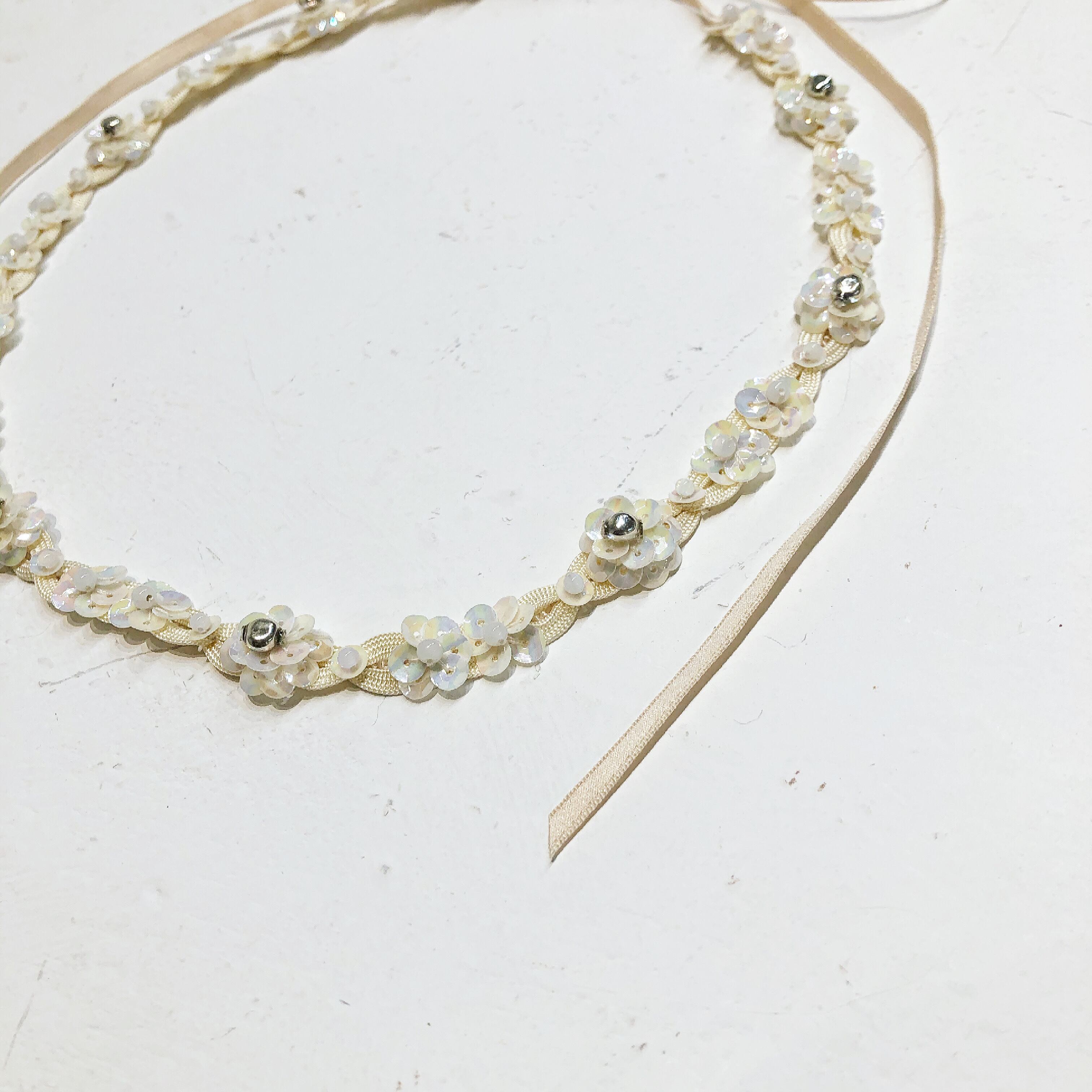 レースにアンティークスパンコールでお花のモチーフに装飾したヘッドリボンと、同じモチーフで合わせて製作したイヤードレスに仕上げました。